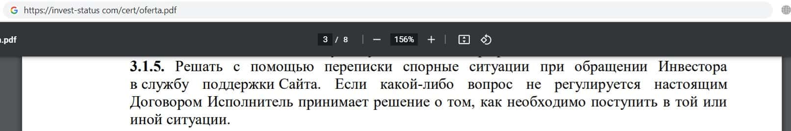 В своём соглашении аферисты Инвест Статус указали, что если возникает спор между компанией и инвестором, то фирма будет принимать решение о урегулировании вопроса.