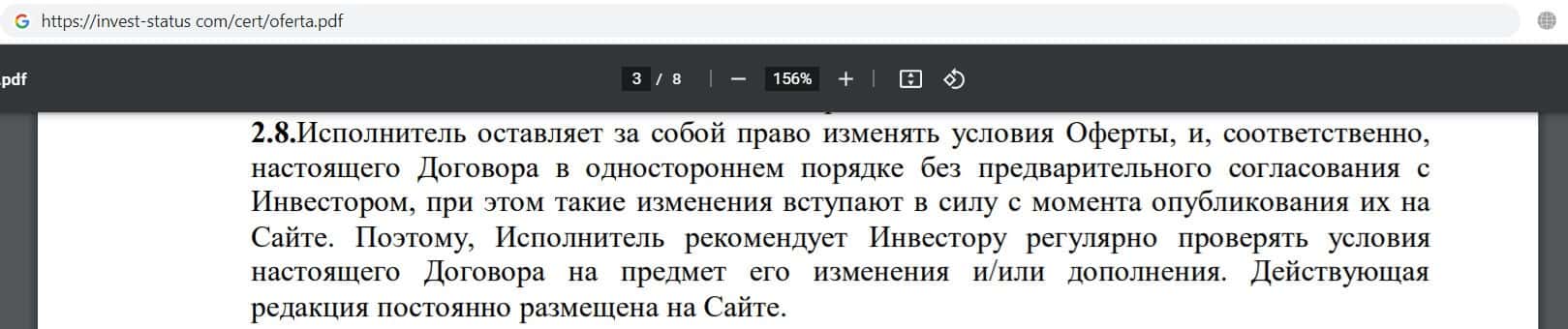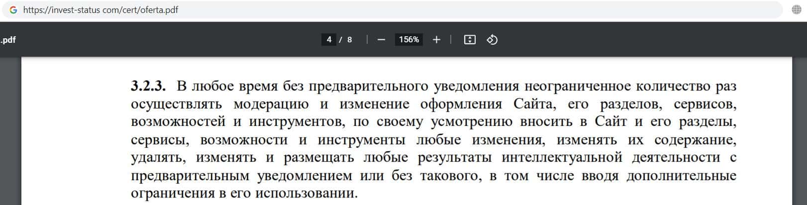 Ещё контора Инвест Статус указала в соглашении пункт, согласно которому жулики могут изменять свой сайт и его содержание по собственному усмотрению неограниченное количество раз.