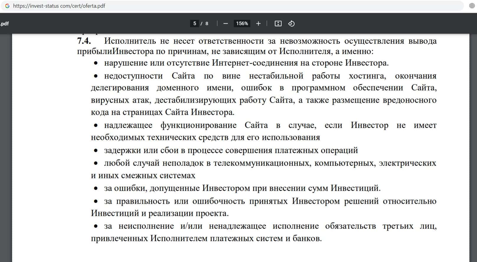Ещё контора махинаторов Инвест Статус указала в соглашении, что может не выводить клиенту его прибыль, а далее перечислила факторы, которые на это влияют.