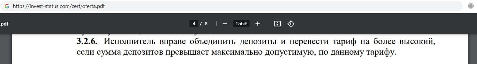 Так же контора финансовых разводил Инвест Статус указала, что без согласия своего клиента может объединить его депозиты и перевести его на другой тариф.