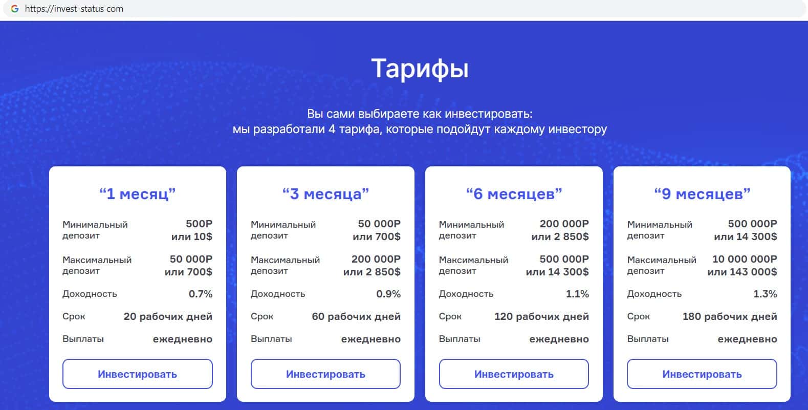 Кидалы Инвест Статус предоставили клиентам 4 тарифа, на 1,3,6,9 месяцев, которые отличаются минимальным депозитом, который варьируется от 500 до 500000 рублей.