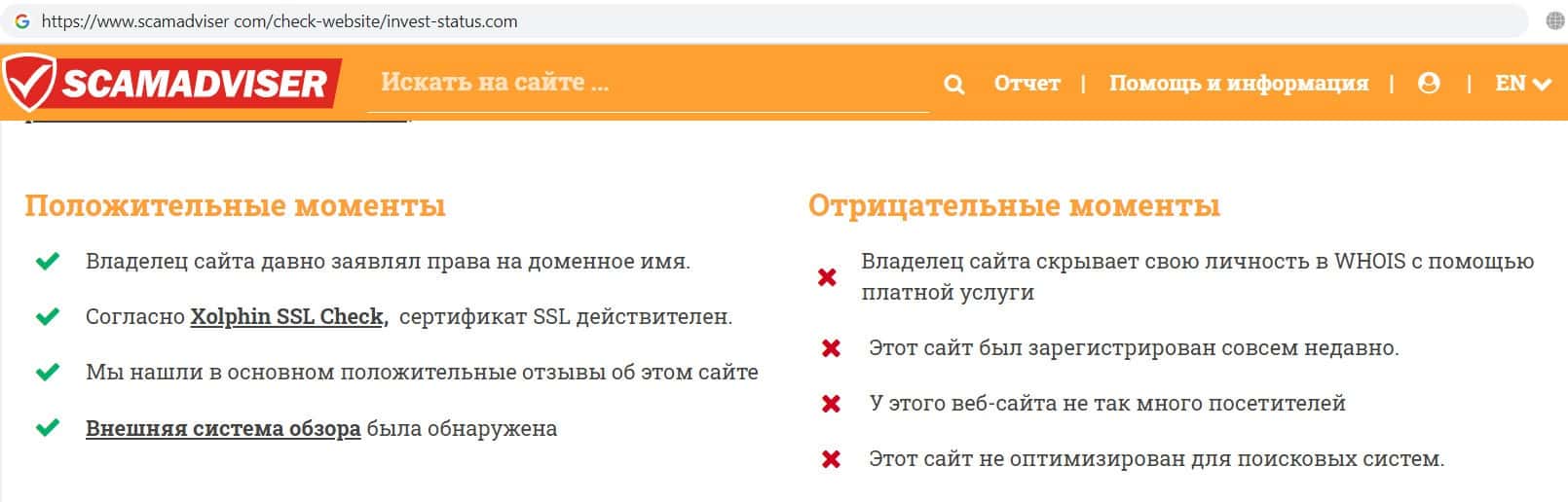 Мнение интернет - ресурса scamadviser com о сайте разводил Инвест Статус