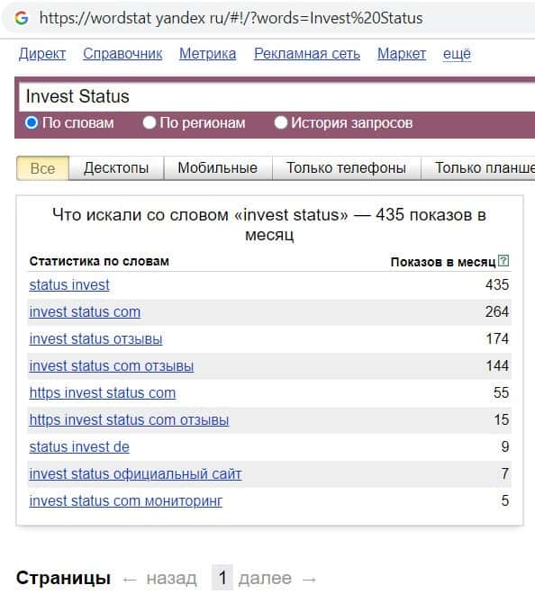 Мы проверили количество запросов компании мошенников Инвест Статус в Яндексе по названию фирмы, а именно "Invest Status". Данный запрос пользователи выполнили 435 раз.