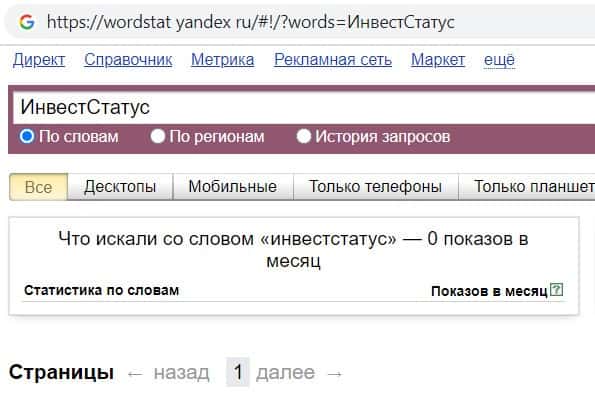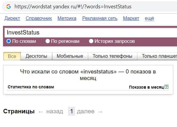 Проверили мы и количество запросов конторы Инвест Статус по русскоязычному названию без пробела, а именно "ИнвестСтатус". данный запрос пользователи так же не выполняли.