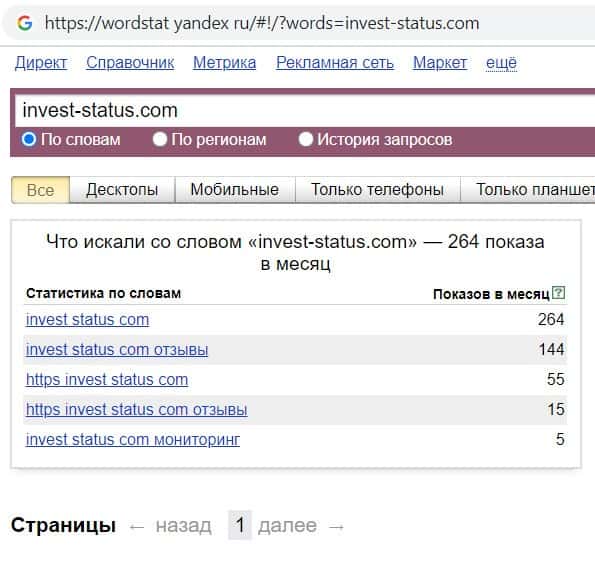 Проверить мы решили и количество запросов компании Инвест Статус по домену фирмы с точкой, а именно "invest-status.com". Этот запрос пользователи выполнили 264 раза за месяц.