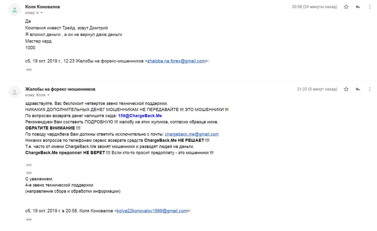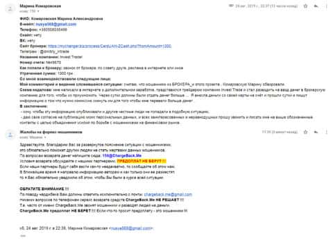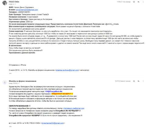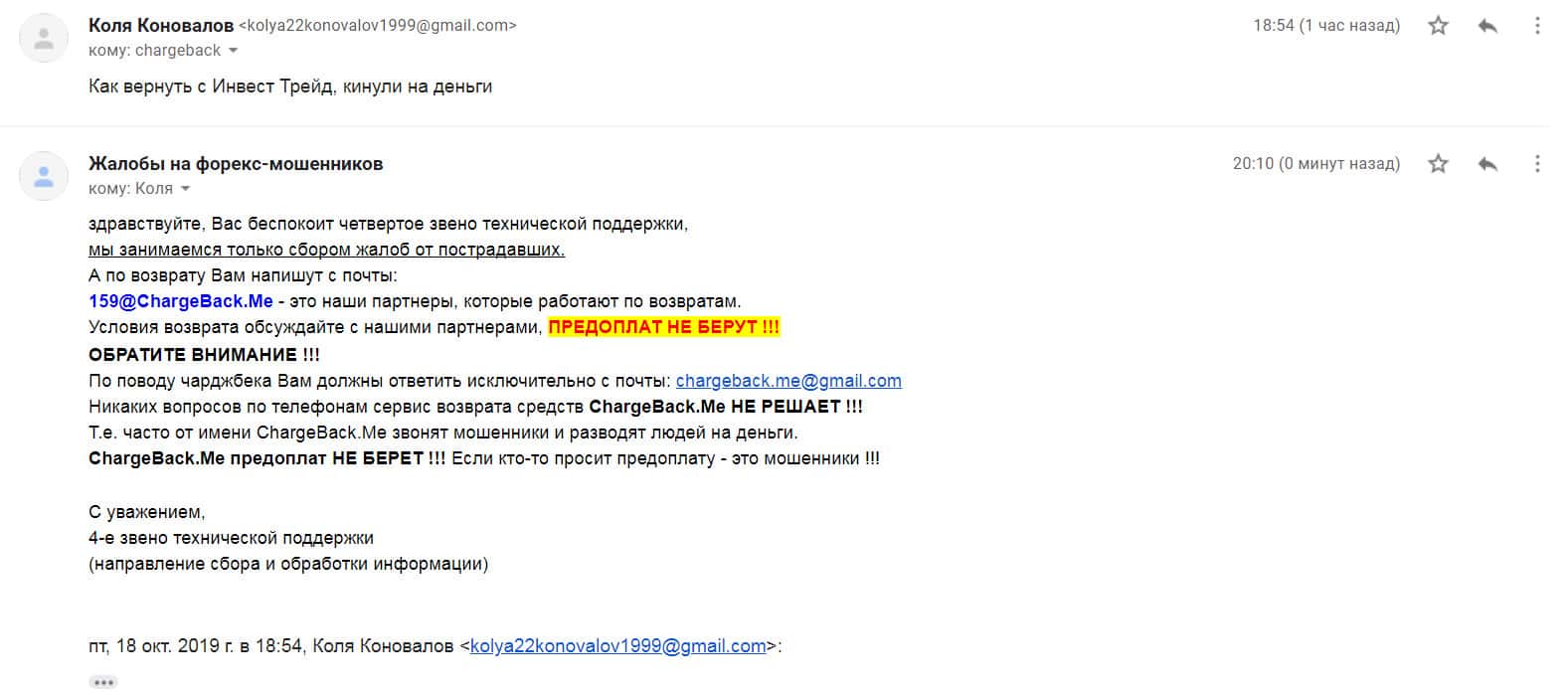 Поводом для написания данной статьи стала жалоба от очередной облапошенной шулерами Invest-Trade жертвы, которая теперь не может вернуть деньги с лохотрона Инвест Трейд. В данной ситуации ресурс форекс-брокерс про рекомендует обращаться в сервис ChargeBack.Me для возврата средств.