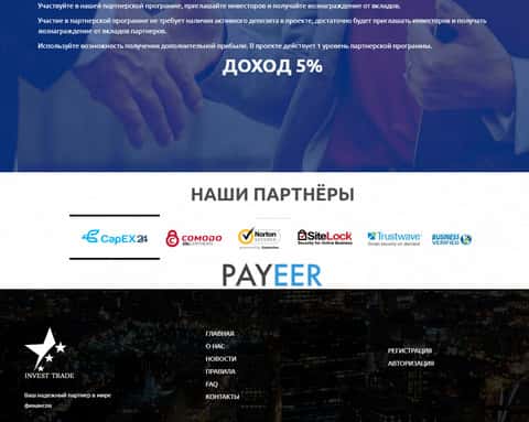 Завершается ресурс мошенников Invest-Trade информацией о партнерской программе шулеров, согласно которой жулики Инвест Трейд будут платить вам деньги за новых пользователей, привлеченных в данный лохотрон, а так же перечнем ссылок на различные страницы сайта.