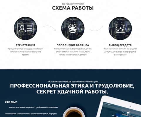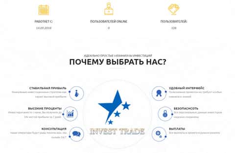 Далее на сайте жуликов Инвест Трейд идет раздел с типичным набором преимуществ, который описывает очередную "уникальную" программу инвестирования с мошенниками Invest-Trade, благодаря которой шулера Инвест Трейд обещают своим клиентам высокий процент прибыли.