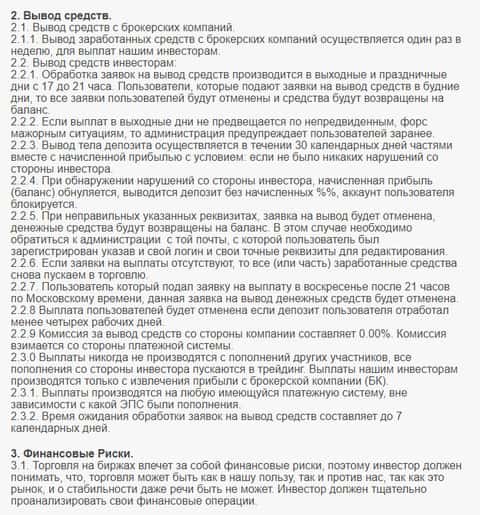 Далее в данных условиях аферистов Инвест Трейд идет информация о выводе средств, в ходе которой шулера Invest-Trade предупреждают о рисках инвестирования спихивая будущую вину на брокера, который, по словам жуликов Инвест Трейд, будет виноват в сливе клиентского депозита.