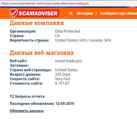 В связи с мошеннической и противозаконной деятельностью аферистов Инвест Трейд его руководители предпочитают анонимность дабы избежать ответственности со стороны правоохранительных органов. А вот о сайте шулеров Invest-Trade можно узнать с помощью ресурса scamadviser com.