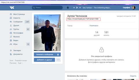 Так же в группе аферистов Инвест Трейд имеется модератор, который собственно и лайкает посты в ней. На изображении, расположенном ниже, вы можете увидеть закрытый профиль в соц. сети Вконтакте человека, указанного в группе мошенников Invest-Trade как модератор.