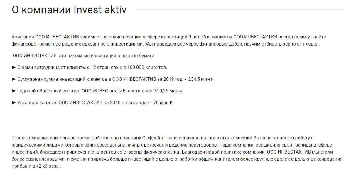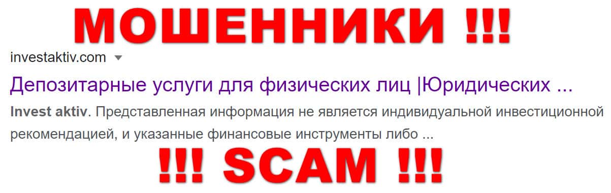 InvestAktiv - очередная шулерская контора, которая берет деньги в управления и под разными предлогами не отдает их своим вкладчикам. Они работают и зарегистрированы в Российской Федерации и есть все подтверждения в интернете, что занимаются мошенничеством. Поэтому, мы настоятельно рекомендуем обходить стороной эту шарашкину контору под названием ИнвестАктив.