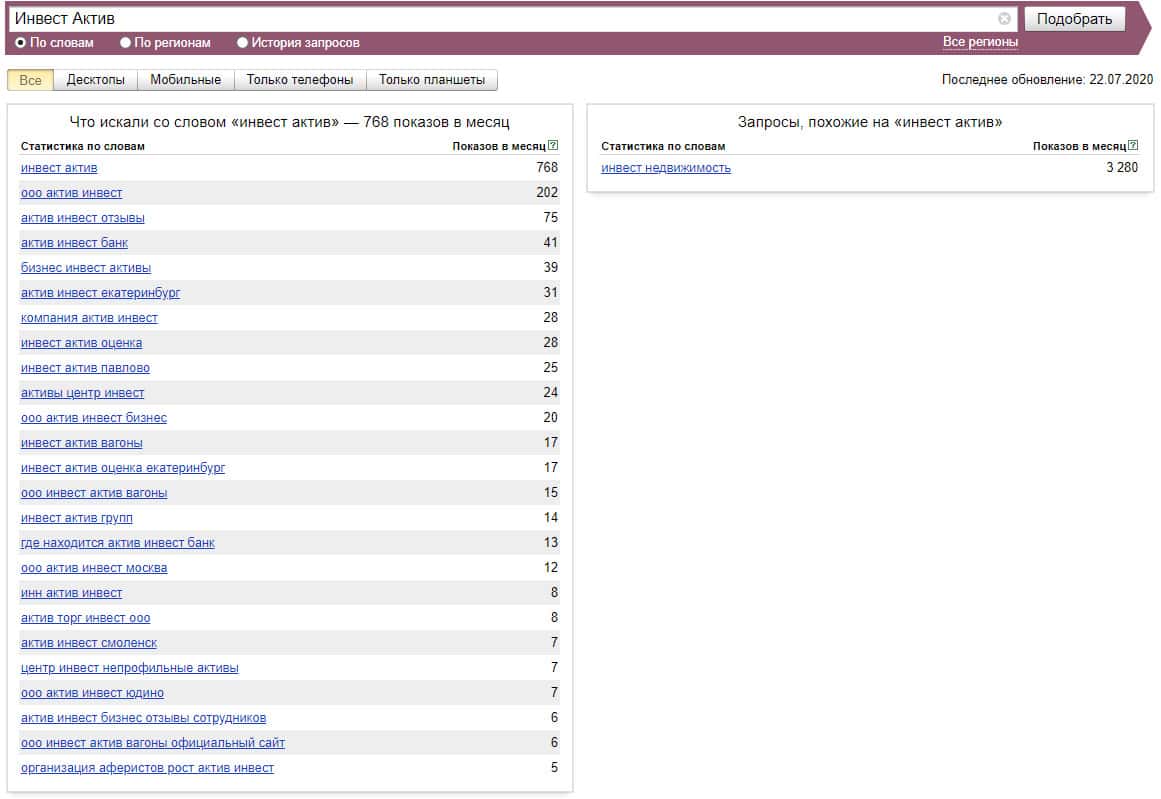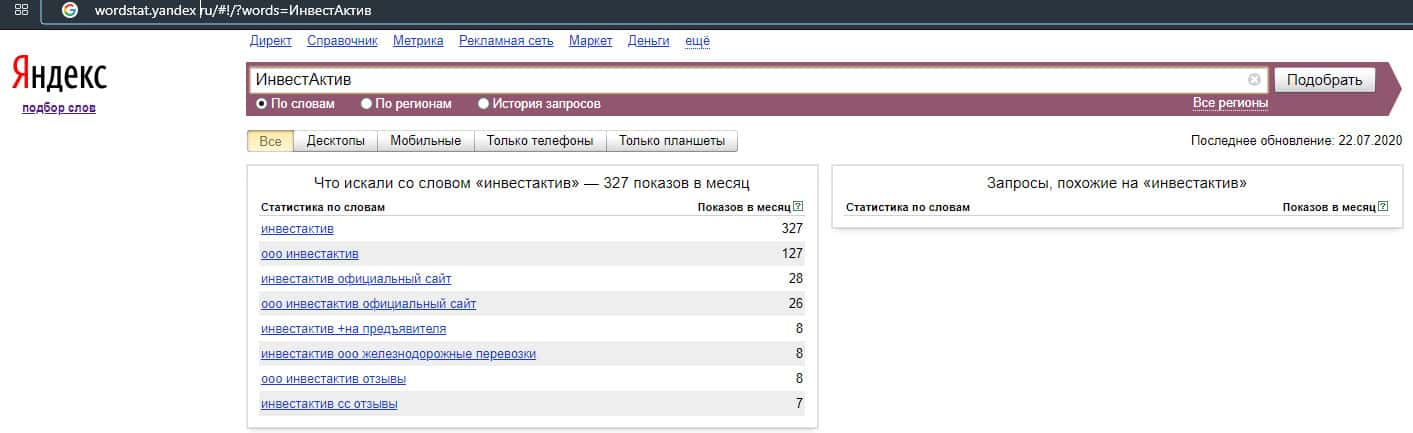 Следующим вариантом, мы решили пробить информацию бренда "Инвест Актив" и, согласно Яндекс Вордстат, запросов было почти в два раза больше, чем предыдущего бренда.
