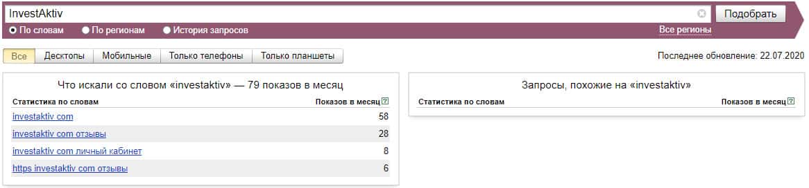 В данном случае мы проверили по версии ресурса Яндекс Вордстат бренд конторы в таком варианте "InvestAktiv" и система выдала 79 запроса за месяц.