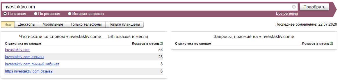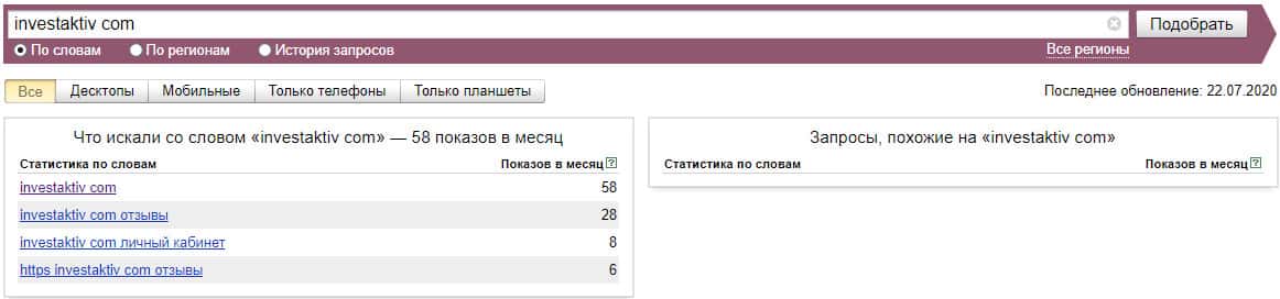 Если ввести бренд в виде официального сайта конторы без точки "investaktiv com", то поисковая система Яндекс не выдает 58 показов за месяц.