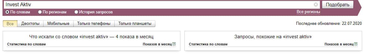 Ситуация с брендом "Invest Aktiv" по версии Яндекс Вордстат, показывает результат в 4 показа за последний месяц что говорит о низкой популярности.