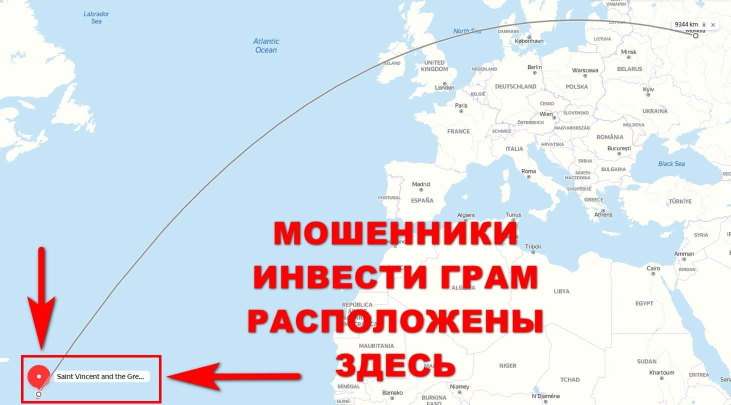 Ниже вы можете ознакомиться с информацией касательно официального местоположения лохотрона Инвести Грам. Мошенники зарегистрированы на острове Сент-Винсент и Гренадины.