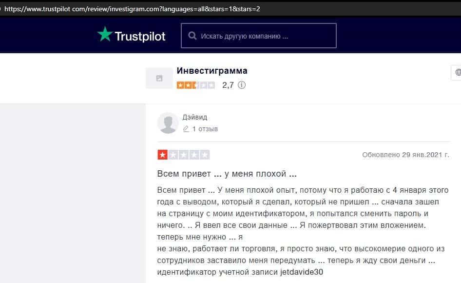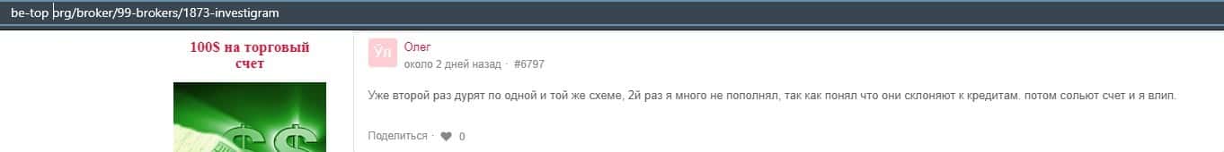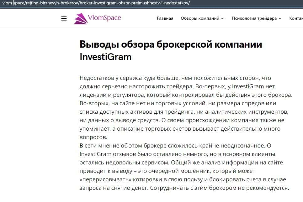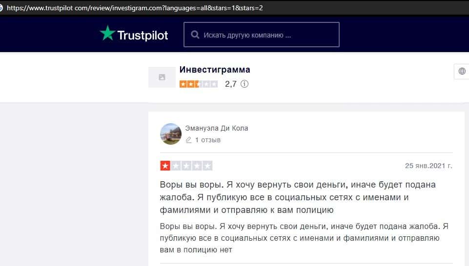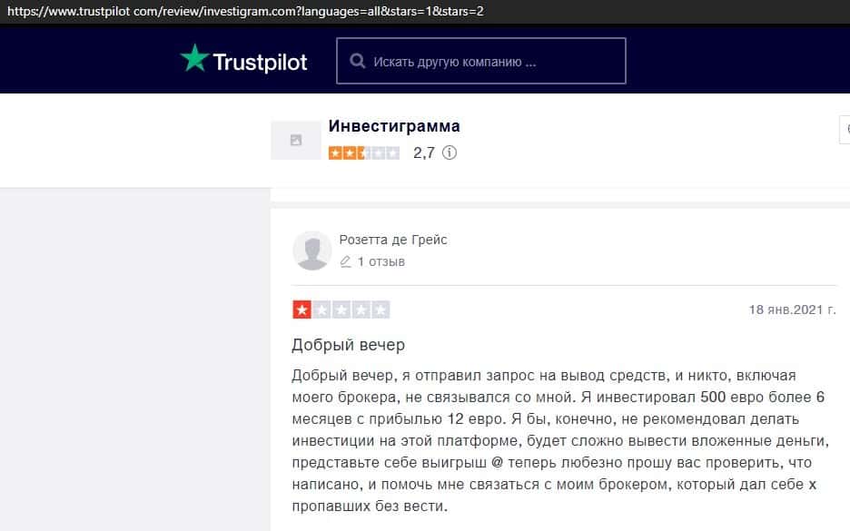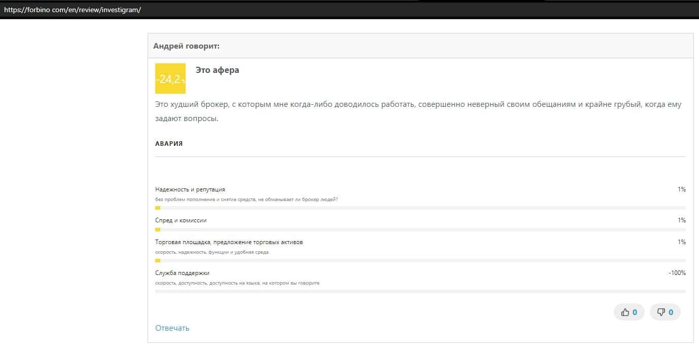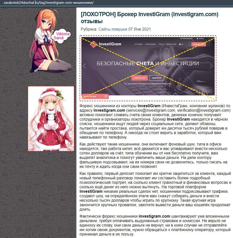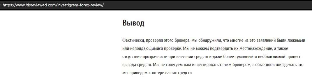 Автор следующего отзыва отметил, что конторе InvestiGram не нужно доверять. По его мнению это один из самых грубых брокеров, с которыми ему только приходило сталкиваться.