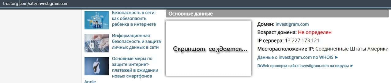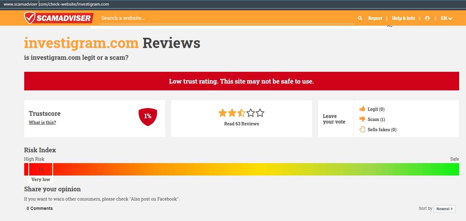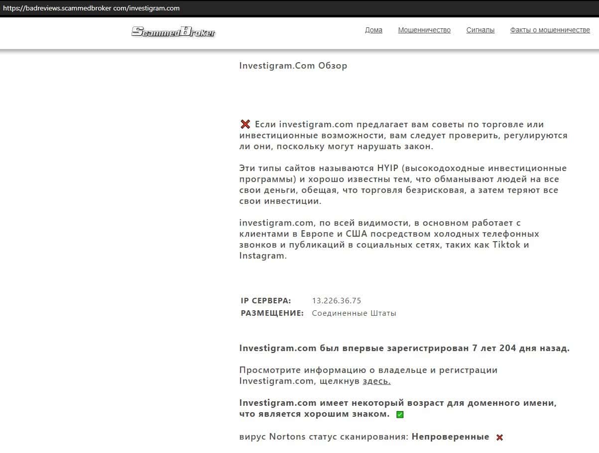 Согласно сайту scamadviser com, ресурс мошенников InvestiGram работает с репутацией мошенников, поэтому туда опасно заходить, не говоря уже о каких-то финансовых операциях.