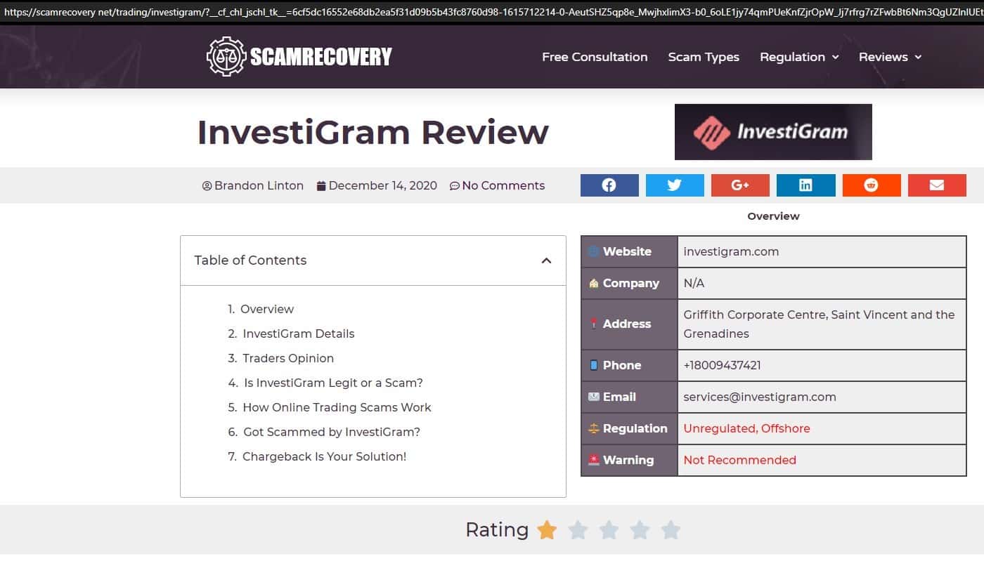 Далее представлена публикация, где можно узнать, что форекс-лохотрон Инвести Грам имеет очень низкий рейтинг, так как это нерегулируемый брокер. Поэтому его не рекомендуют.