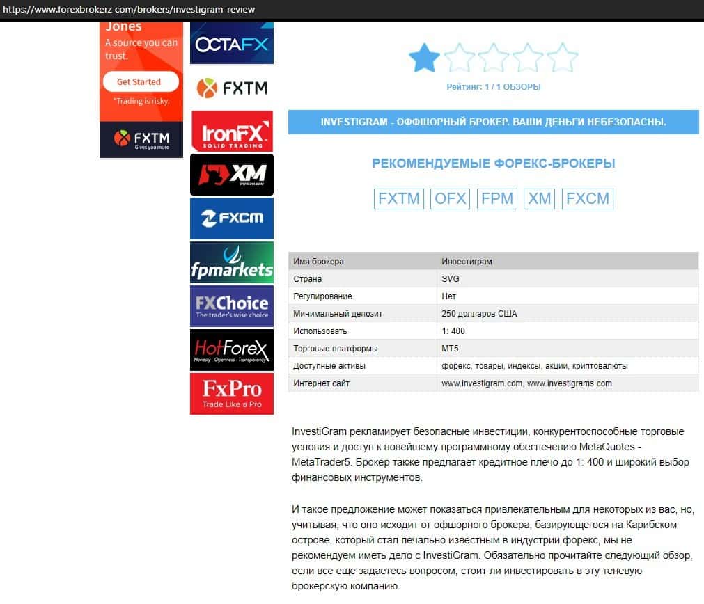 Так же обзор компании кидал InvestiGram сделал сайт forex-scam org, который указал, что данная фирма является псевдоброкером, у которого репутация финансового мошенника.