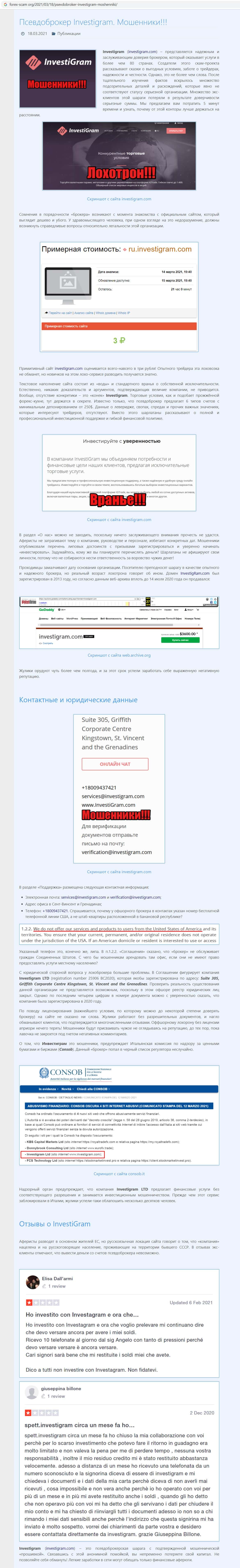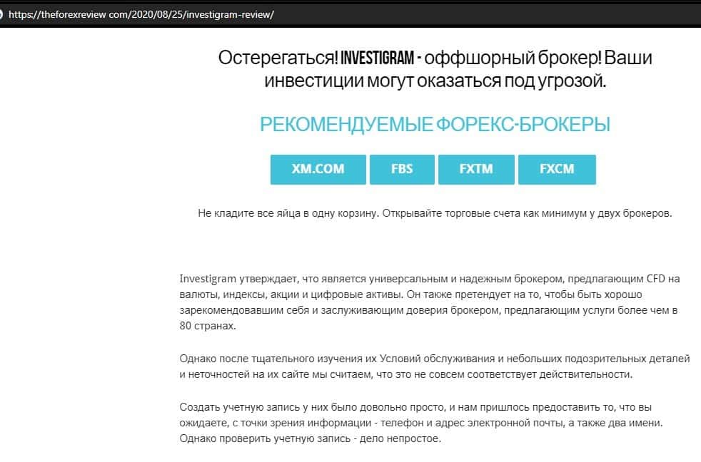 Далее указано, что мошенническая контора InvestiGram это оффшорный псевдо-брокер, который предлагает клиентам открыть счет и вложить деньги, чего делать не рекомендуется.