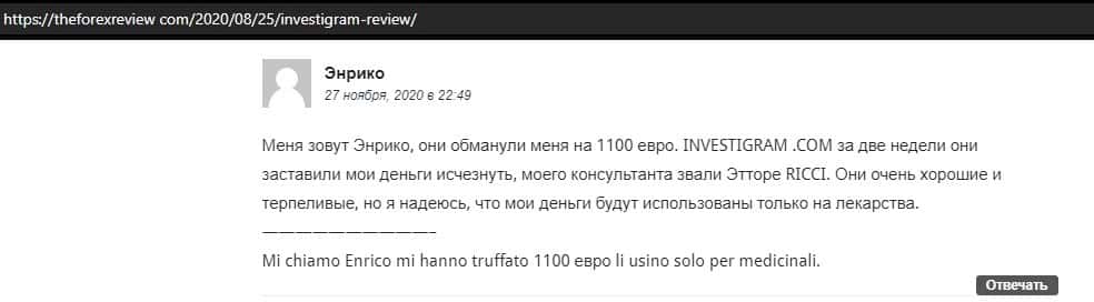 Ниже представлен еще один отзыв от клиента конторы InvestiGram. Он рассказал, что мошенники обманули его на 1100 евро, и все его деньги после перевода исчезли со счета.