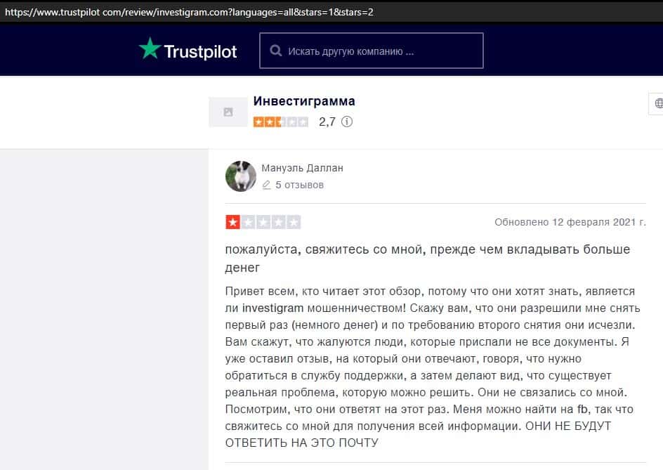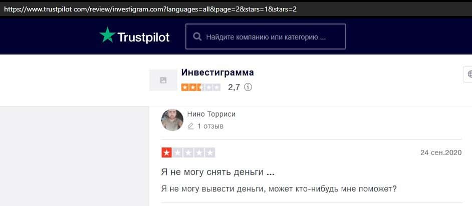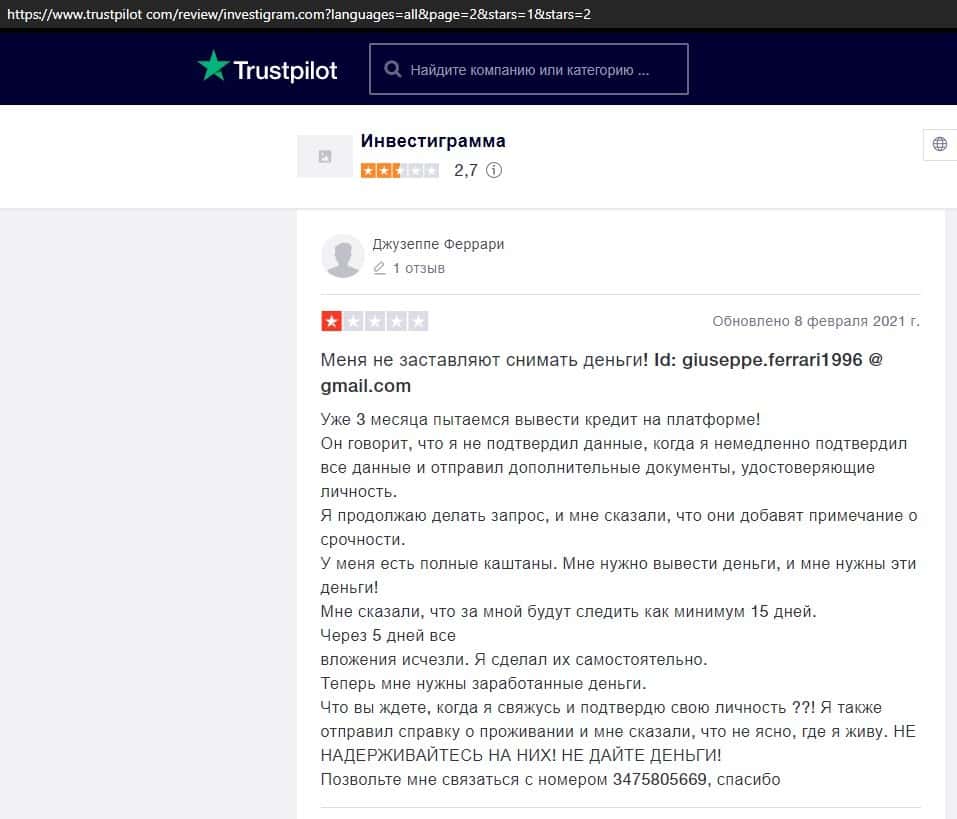 В еще одном подробном отзыве клиент рассказал, как он связался с лохотроном Инвести Грам. Мошенники выманили у него деньги, а после заявки на вывод, он не получил ни цента.
