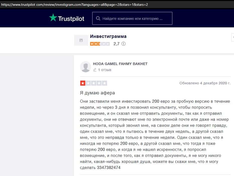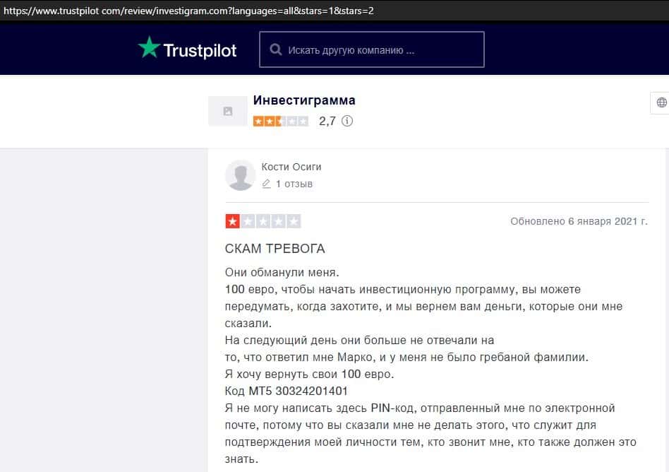 Пострадавший рассказал, что мошенническая контора Инвести Грам заставила его инвестировать порядка 200 евро. После теста платформы, никто вложенные деньги не вернул.