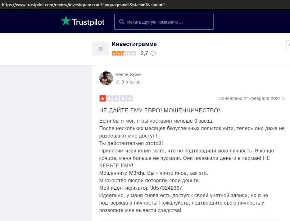 Трейдер пожаловался, что мошенническая контора Инвести Грам обворовала его на не малую сумму денег. Это все связано с тем, что доверять подобным шарагам нельзя.