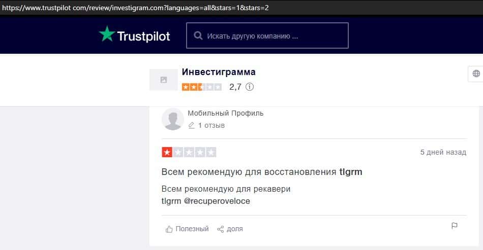 В данном отзыве клиент рассказал что у него получалось восстанавливать деньги с конторы Инвести Грам с помощью специального сервиса. А так обычным людям деньги не вернуть.