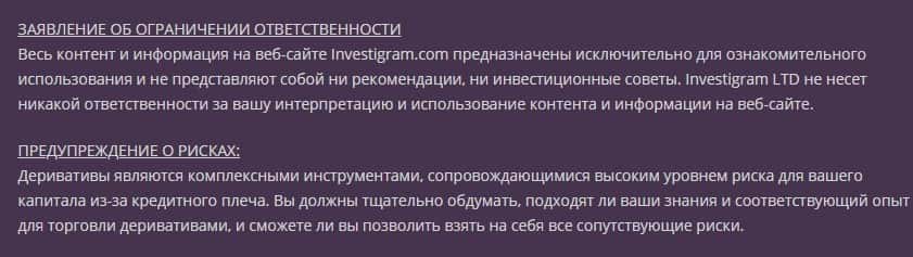 Касательно регуляции деятельности конторы Инвести Грам сказать нечего, так как у них нет лицензий. Они прикрываются предупреждением о рисках, а также отказом от ответственности.