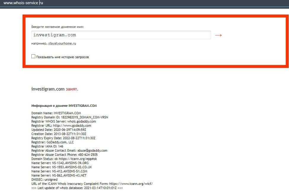 Чтобы проверить, кто является владельцем сайта InvestiGram мы решили обратиться на ресурс whoise-service ru. Как оказалось данные скрыты из-за их мошеннической деятельности.
