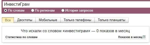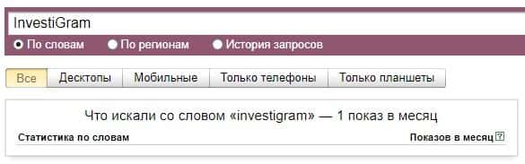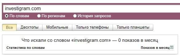 Та же ситуация и с обычным сайтом "investigram.com", данные о котором в запросах Яндекс Вордстат были не обнаружены, так как не набрали ни единого показа за последний месяц.