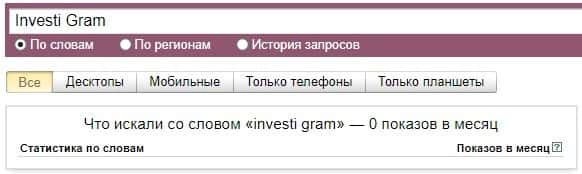 По версии Яндекс Вордстат мошенники с брендом "Инвести Грам" не набрали ни единого показа за месяц, что говорит об их несомненно отсутствующую популярность.