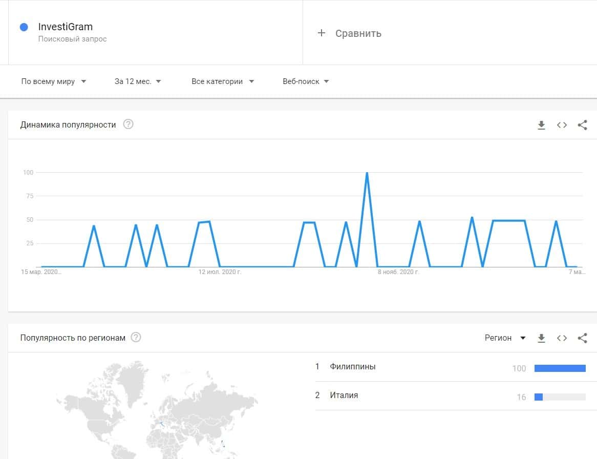 По поводу запроса бренда "InvestiGram", шулерская организация набрала популярность в поисковой системе Гугл среди таких стран как: Филиппины и Италия.