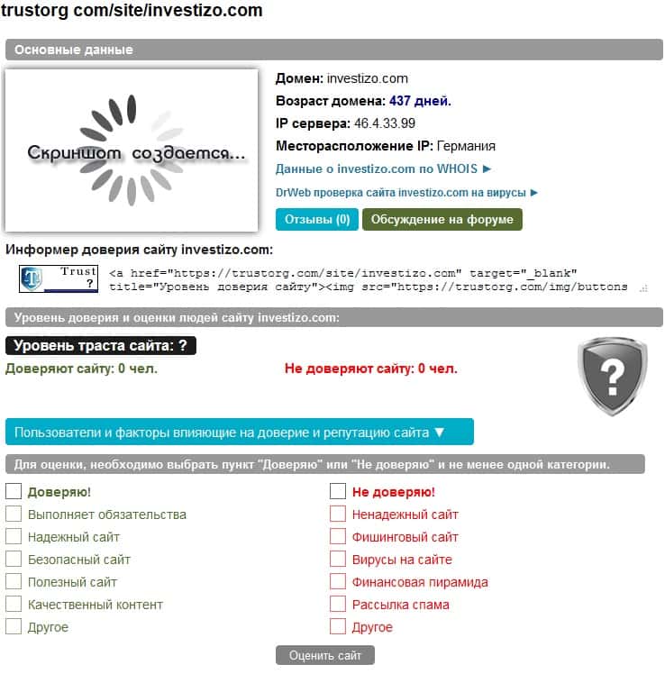 Есть такой известный оценочный портал в рунете, как "Доверие в Сети". На нем каждый желающий пользователь может поставить свою оценку работе любой компании. Так вот тут жулики Investizo тоже успели наследить - они забросали сервис жалобами, чтобы те удалили негативные комментарии о них. Но это должно вас только сильнее настораживать.