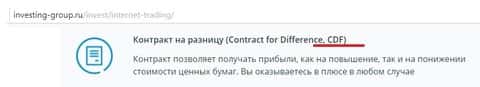 На публикации ниже представлен примечательный информационный материал, который был взят на сайте конторы Инвестинг Груп. Среди инструментов для торговли в Investing Group представлен такой популярный ныне форекс-продукт для трейдинга как CFD. Но так называемый специалисты из Инвестинг Груп не удостоились даже правильно написать название этого инструмента.