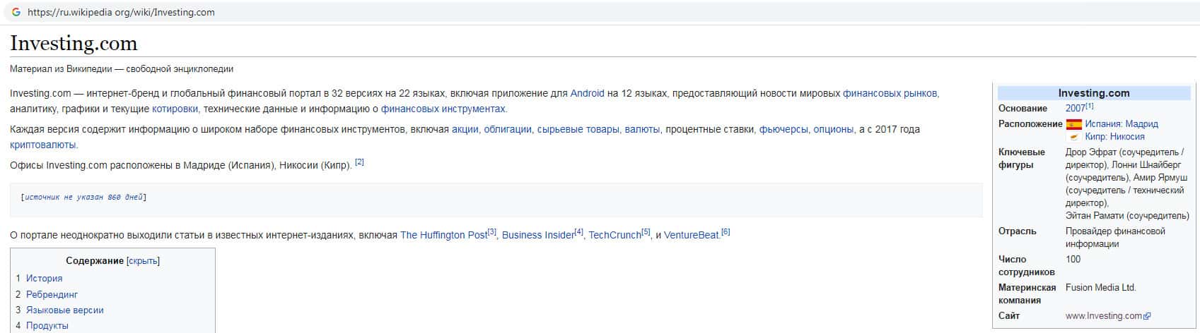 На веб-сайте википедиа орг замечена информация о компании Инвестинг Ком, которая не имеет никакого отношения к сайту аферистов Investing1, которые назвали свой онлайн-ресурс таким образом, что пользователь может его легко перепутать. Регистрируясь на каком-либо сайте обращайте свое внимание на домен сайта. Будьте осторожны !!!