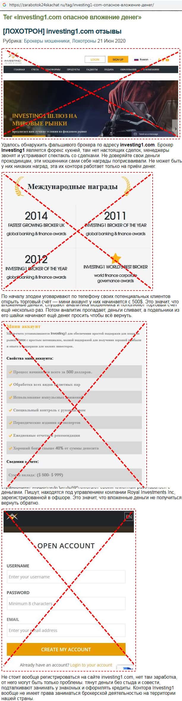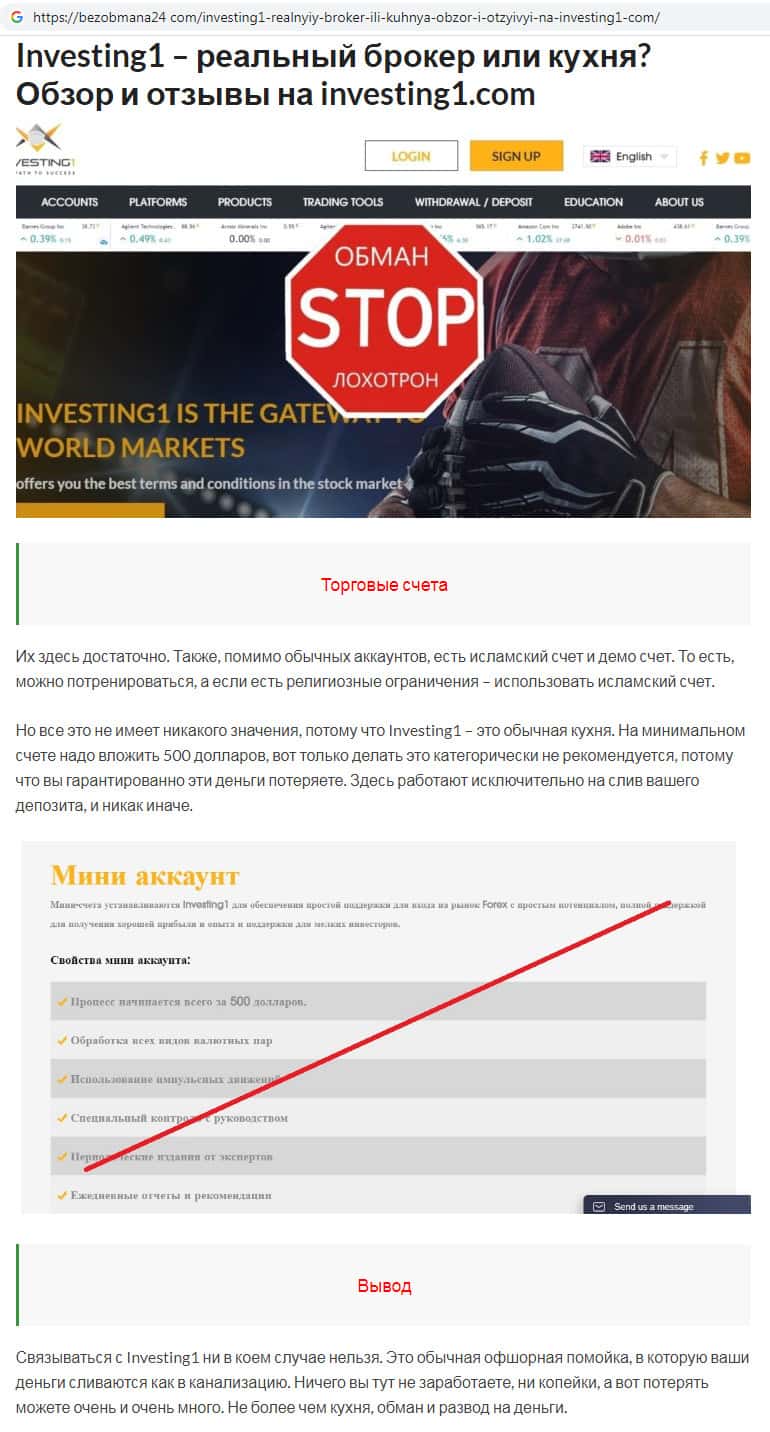 На интернет-сервисе bezobmana24 com найдена статья-отзыв о мошенниках Investing1, которые заманивают людей на свой фейковый сайт якобы разнообразием торговых инструментов, а так же торговых счетов, от которых будто зависит то какая будет прибыль. Вся информация на сайте шараги Инвестинг1 - ложь и не более того !!!