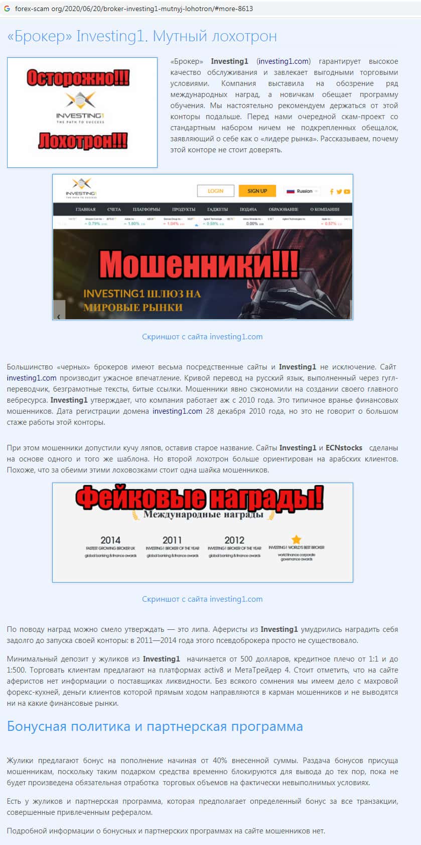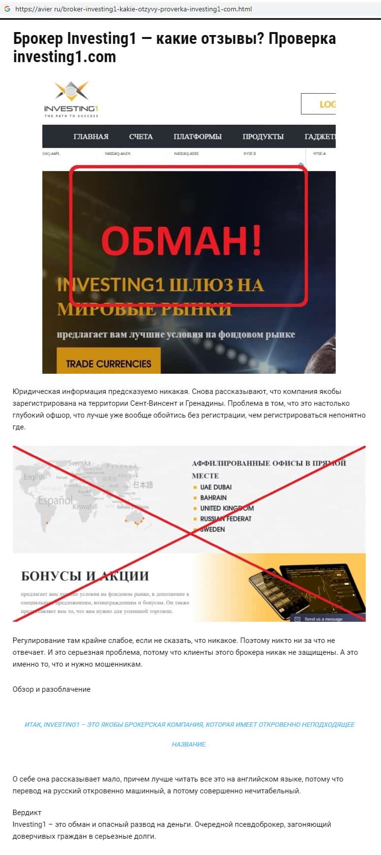 На информационном интернет-сервисе avier ru расположена статья об аферистах Investing1, которые претворяются надежным и честным брокером, которым на самом деле не являются. Заработать прибыль на сайте скам-конторы Инвестинг1 невозможно, поскольку организация липовая !!!