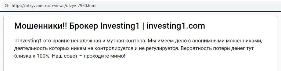 На веб-портале otzyvcom ru обнаружен комментарий о шулерах Investing1. Данную мошенническую организацию следует обходить стороной и ни в коем случае не регистрироваться на их дырявом интернет-сервисе. Подобных интернет-лохотронов в сети очень много. Ни в коем случае не верьте аферистам Инвестинг1 !!!