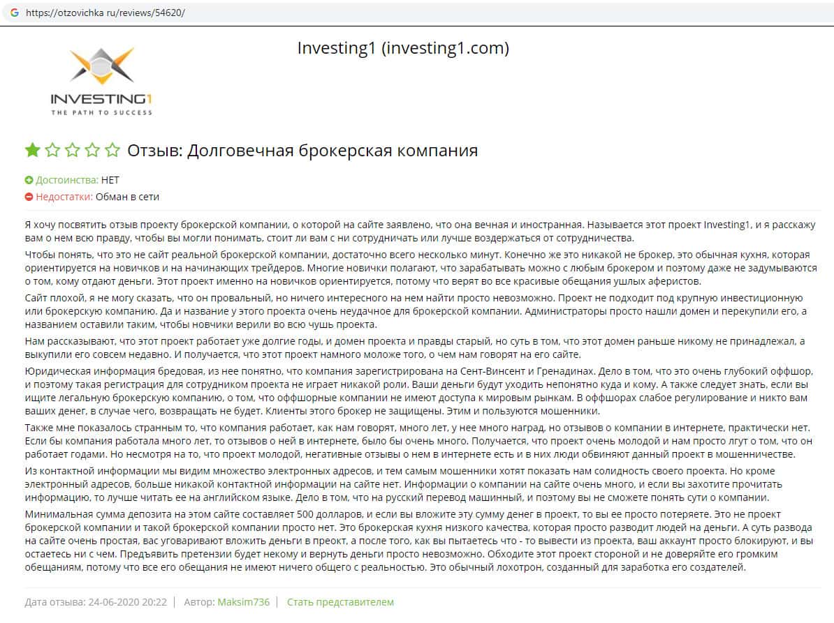 На сайте-отзовике отзовичка ру отыскан комментарий о мошеннической организации Инвестинг1, автор которого пишет, что минимальная сумма депозита на их фальшивом сайте составляет 500 долларов. При попытке вывести свои денежные средства шулера Investing1 блокируют аккаунт клиента, оставляя все деньги себе.