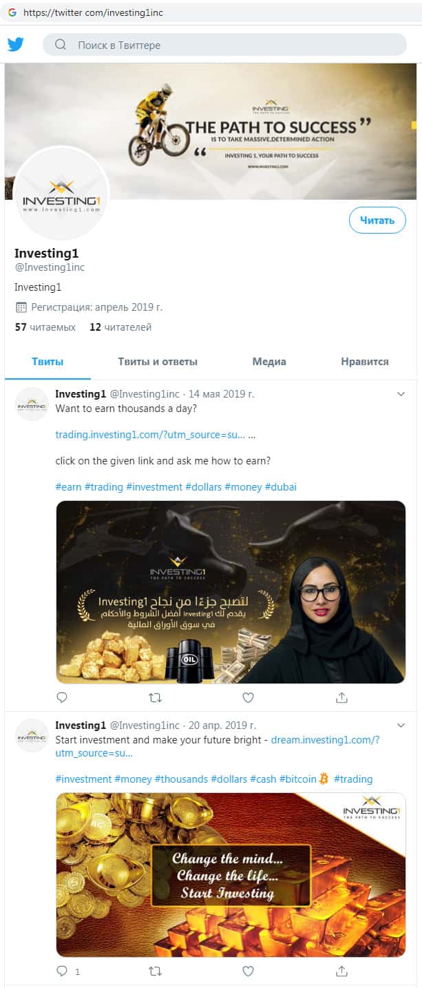 Шулера Investing1 вовлекают людей на свой фальшивый сайт через соц сеть twitter com