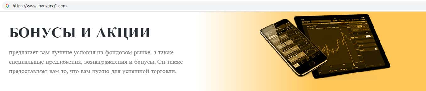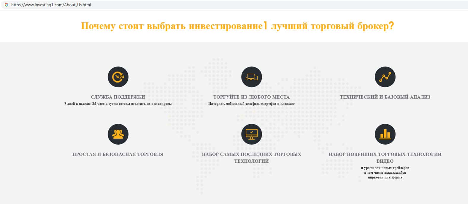 Мошенники Investing1 на своем фальшивом сайте опубликовывают совершенно не правдивую информацию, которая не имеет никакого отношения к реальной деятельности скам-компании. Имеется ввиду тот факт, что аферисты врут на каждом шагу о том, что предоставляют возможность получать невероятную прибыль, торгуя на их дырявом сайте.