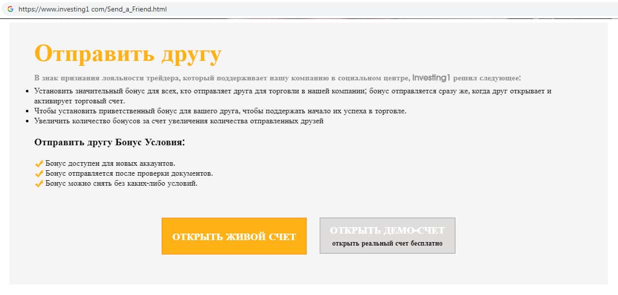 Так же аферисты Investing1 на своем официальном сайте опубликовали информацию о том, что полученными бонусами якобы можно поделиться с другом или же снять без каких-либо условий. Но необходимо понимать то, что сразу после регистрации бонусы не начисляются. Поэтому велика вероятность того, что все Ваши деньги останутся на счету компании Инвестинг1.
