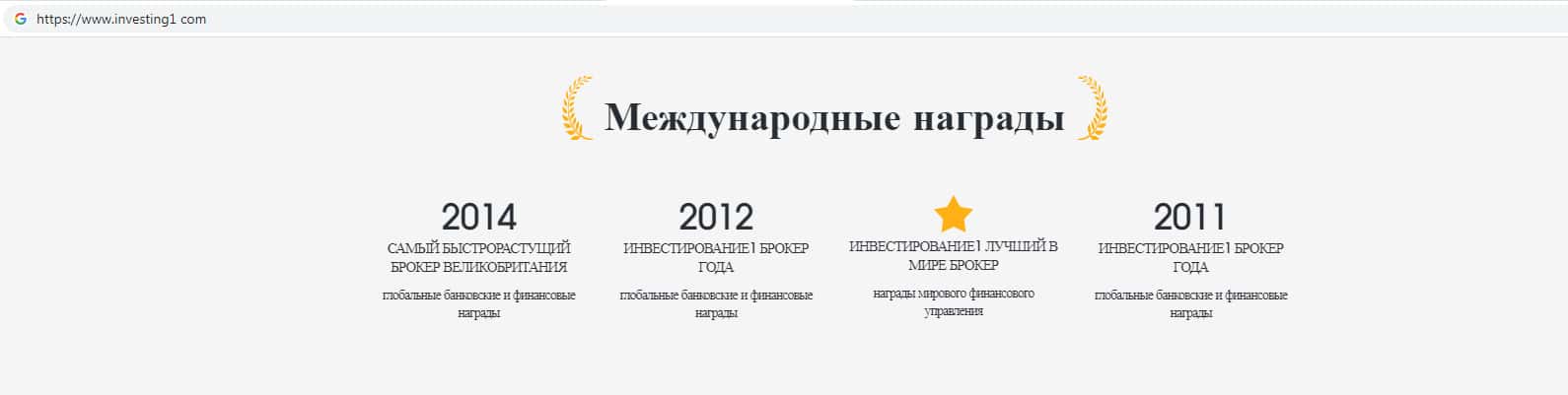 На официальном сайте скам-брокера Investing1 отыскана информация, которая вероятнее всего не имеет никакого отношения к данной организации, а именно какие-то награды, а точнее изображение наград. Не верьте мошеннической организации Инвестинг1 и их якобы достижениям, они ничего не значат !!!