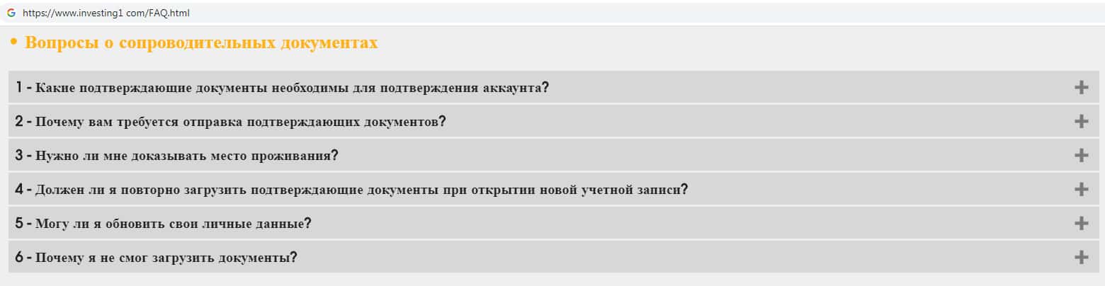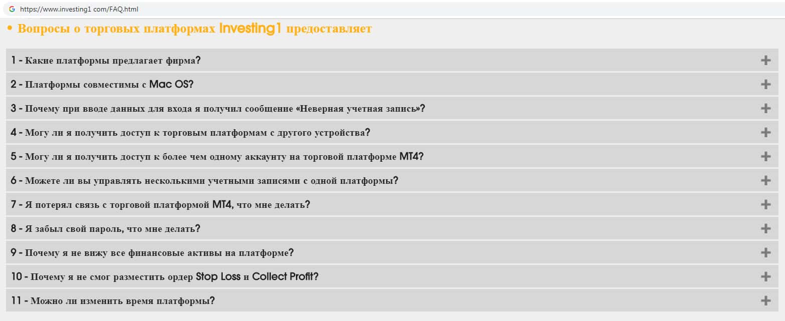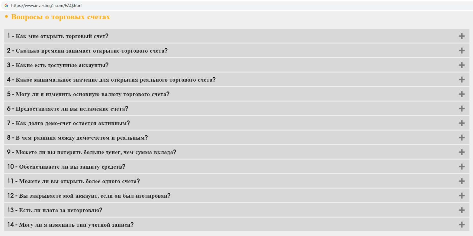 Так же скам-брокер Инвестинг1 предоставляет перечень вопросов о торговых счетах, а так же о настройке учетной записи, которые в действительности никак не помогут клиенту при попытке получения какой-либо прибыли. Шулера Investing1 вешают людям лапшу на уши о якобы многофункциональности их сайта.