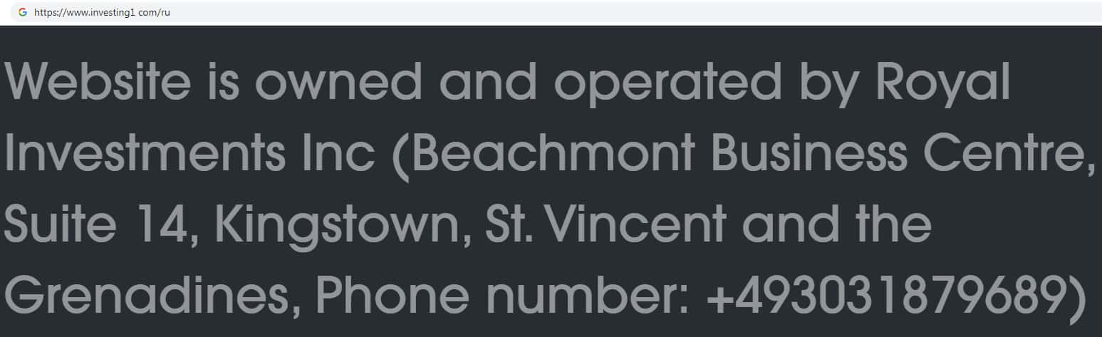 Данный интернет-лохотрон под названием Инвестинг1 принадлежит юридическому лицу, находящемуся в одном из оффшоров на острове Сент-Винсент и Гренадины, где зарегистрировано немалое количество подобных организаций. Это не дает право предоставлять свои брокерские услуги на территории Российской Федерации.