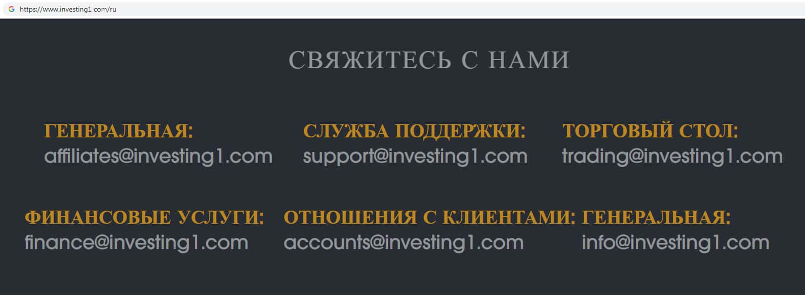 - адреса электронной почты брокерской конторы Investing1: affiliates@investing1 com, support@investing1 com, trading@investing1 com, finance@investing1 com, accounts@investing1 com, info@investing1 com